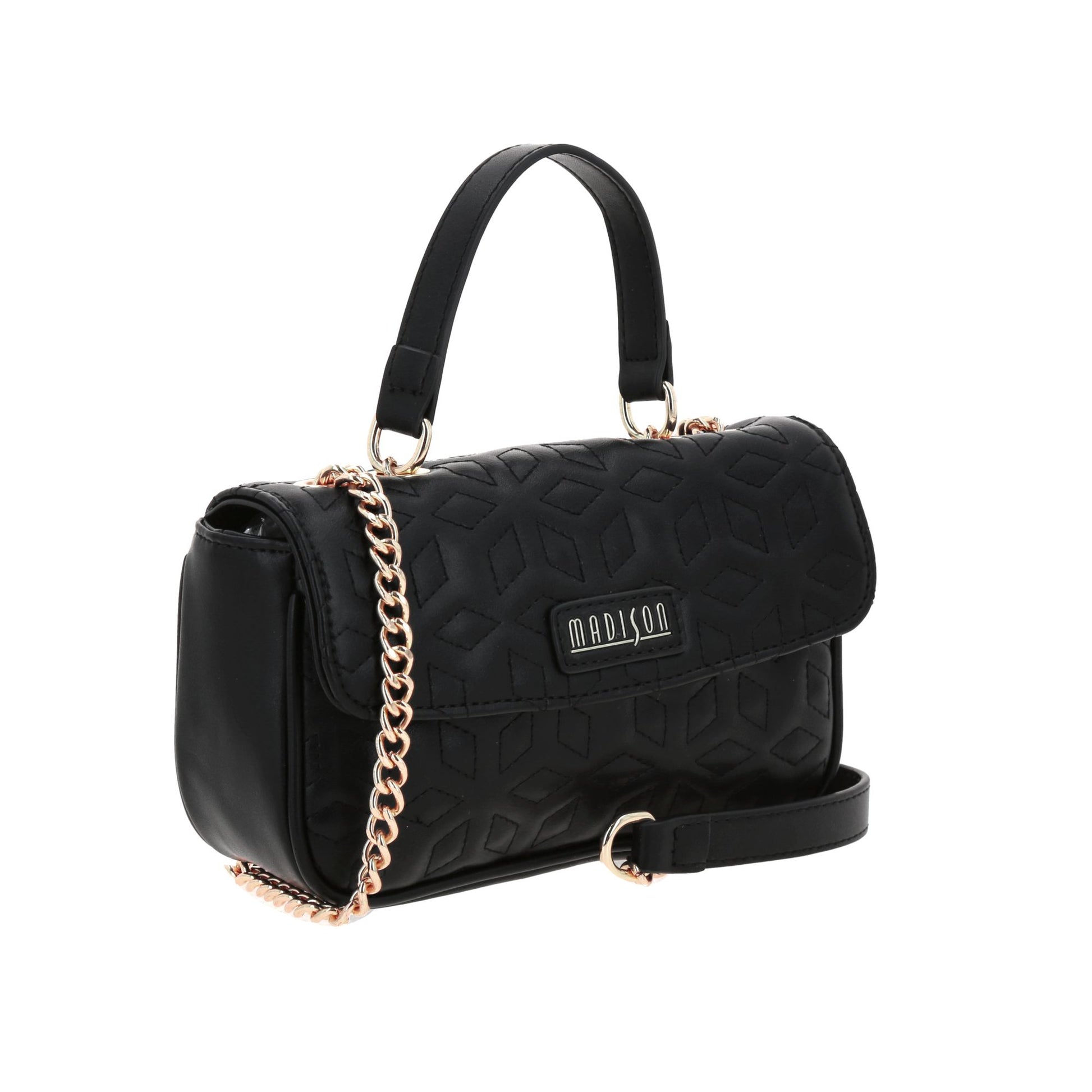 Bolsa De Mano 109-Ch-Md25101-3 Negro Marca ?? Bolso Negro Madison Con Cadena Dorada Y Textura Geométrica Elegancia Con Carácter. Este Bolso Negro Estructurado Destaca Por Su Diseño Texturizado En Patrón Geométrico Y Detalles Metálicos Dorados Que Aportan Sofisticación. La Cadena Dorada Como Asa Le Da Un Toque Glam, Mientras Que El Logo Frontal “Madison” Refuerza Su Estilo Moderno Y Refinado. Ideal Para Eventos Especiales, Salidas Nocturnas O Como Complemento Chic En El Día A Día. Un Accesorio Que Transforma Tu Look Con Fuerza Visual Y Versatilidad. Descubre Más Modelos Que Combinan Diseño Y Funcionalidad.