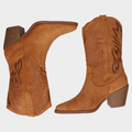 Bota Dama 50-P24F512-1 Camel ?? Botas Cowboy Café Con Bordado Clásico Y Punta Fina Tradición Con Estilo Contemporáneo. Estas Botas Tipo Cowboy En Gamuza Café Presentan Punta Fina, Tacón Medio Angulado Y Bordado Decorativo En Forma De Hoja O Llama Sobre El Tubo. Su Diseño Simétrico Y Acabado Texturizado Las Hacen Ideales Para Looks Bohemios, Conjuntos Con Inspiración Western O Como Pieza Protagonista En Atuendos Otoñales. Un Calzado Que Transmite Carácter, Autenticidad Y Presencia. Descubre Más Modelos Que Celebran El Diseño Clásico Con Fuerza Visual Y Detalles Artesanales.