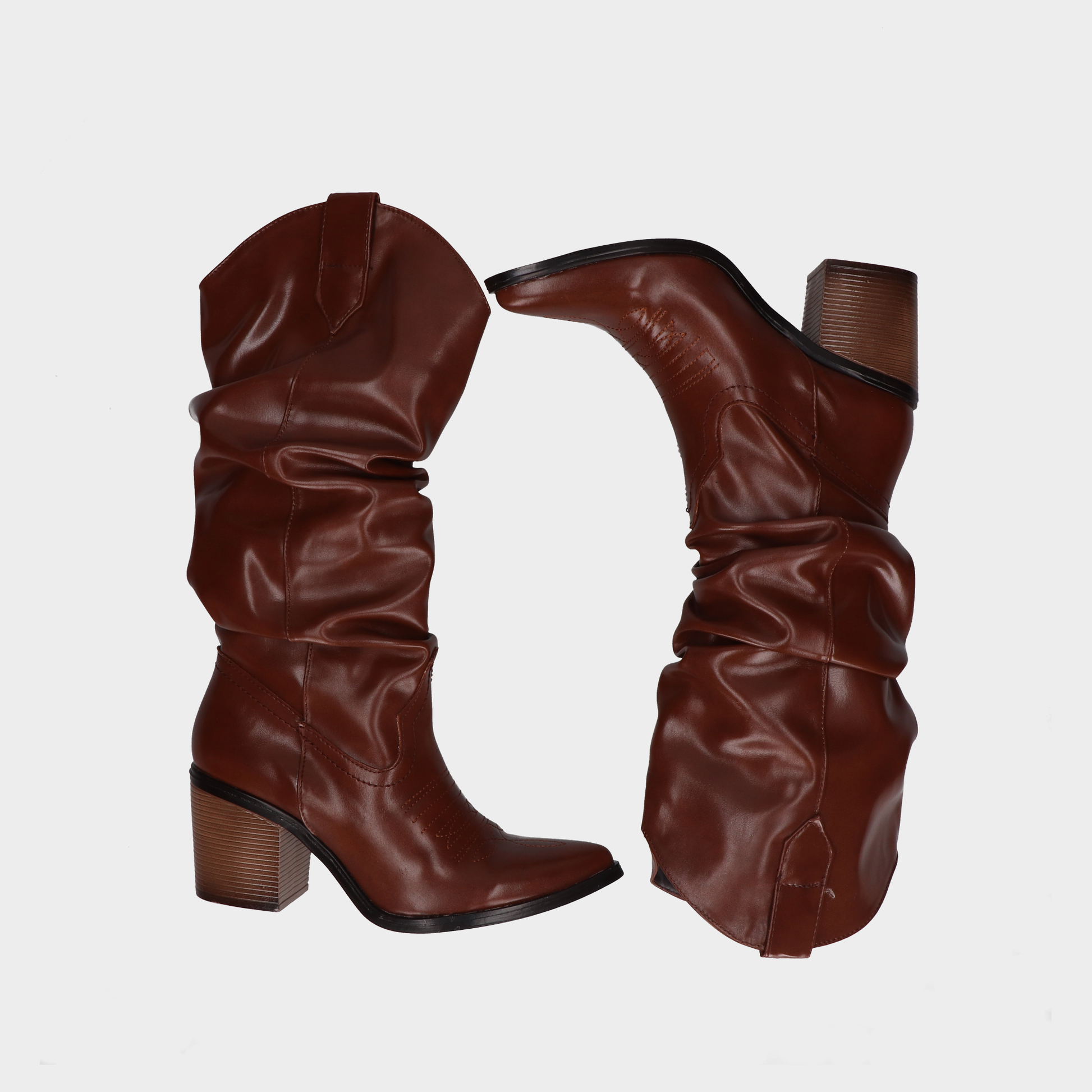 Bota Dama 65-Muss-6045 Camel ?? Botas Cowboy Marrón Con Tacón Grueso Y Corte Occidental Estilo Relajado Con Esencia Vaquera. Estas Botas Mid-Calf En Tono Marrón Combinan Punta Afilada, Tacón Grueso Y Diseño Tipo Cowboy Con Costuras Decorativas En El Empeine Y Corte Occidental En La Parte Superior. El Acabado Arrugado En El Tubo Y Las Tiras Laterales Para Calzar Aportan Carácter Visual Y Comodidad. Ideales Para Looks Boho, Urbanos O Como Pieza Protagonista En Outfits De Temporada. Un Calzado Que Transmite Autenticidad, Estilo Y Versatilidad. Descubre Más Modelos Que Celebran La Moda Con Inspiración Western Y Diseño Contemporáneo.