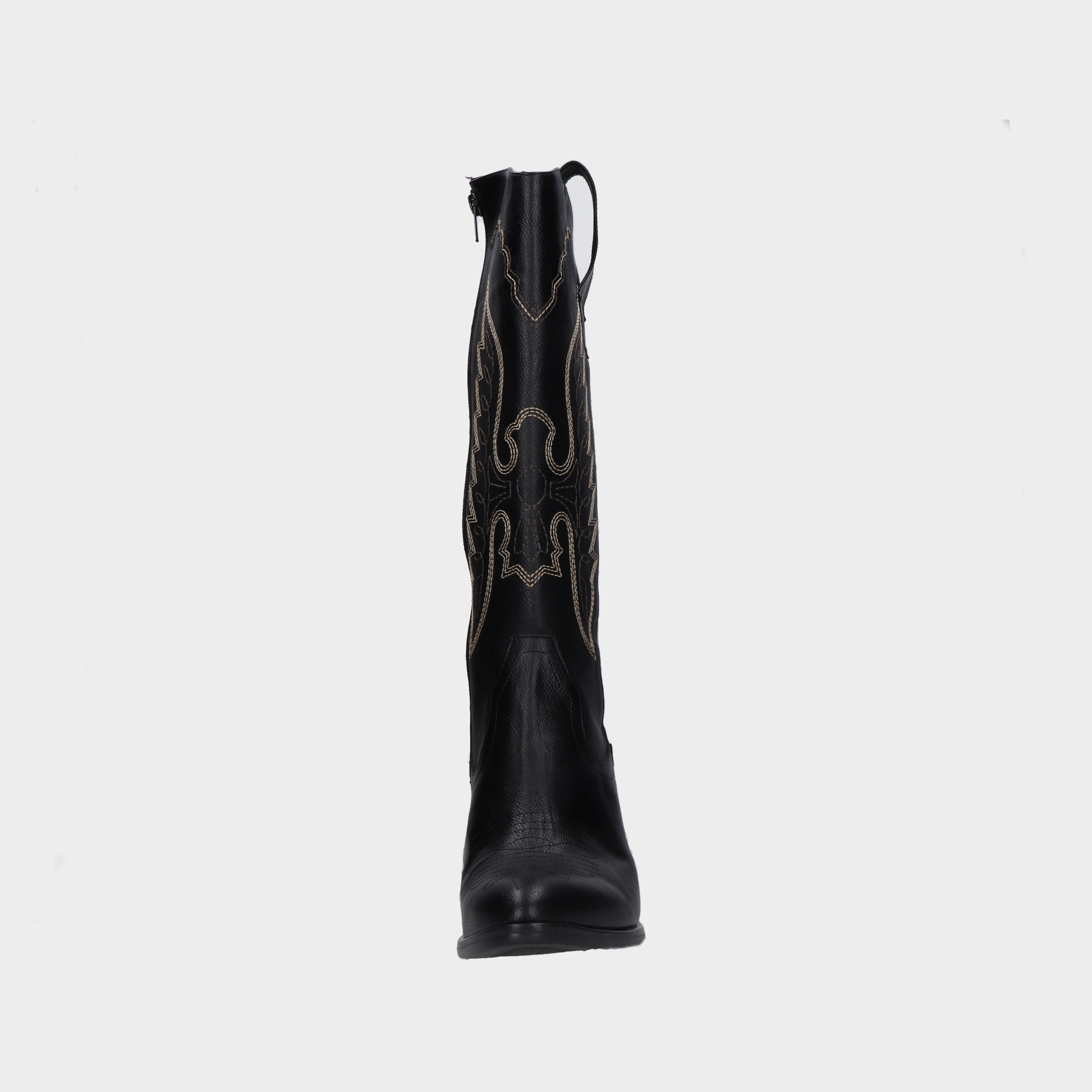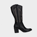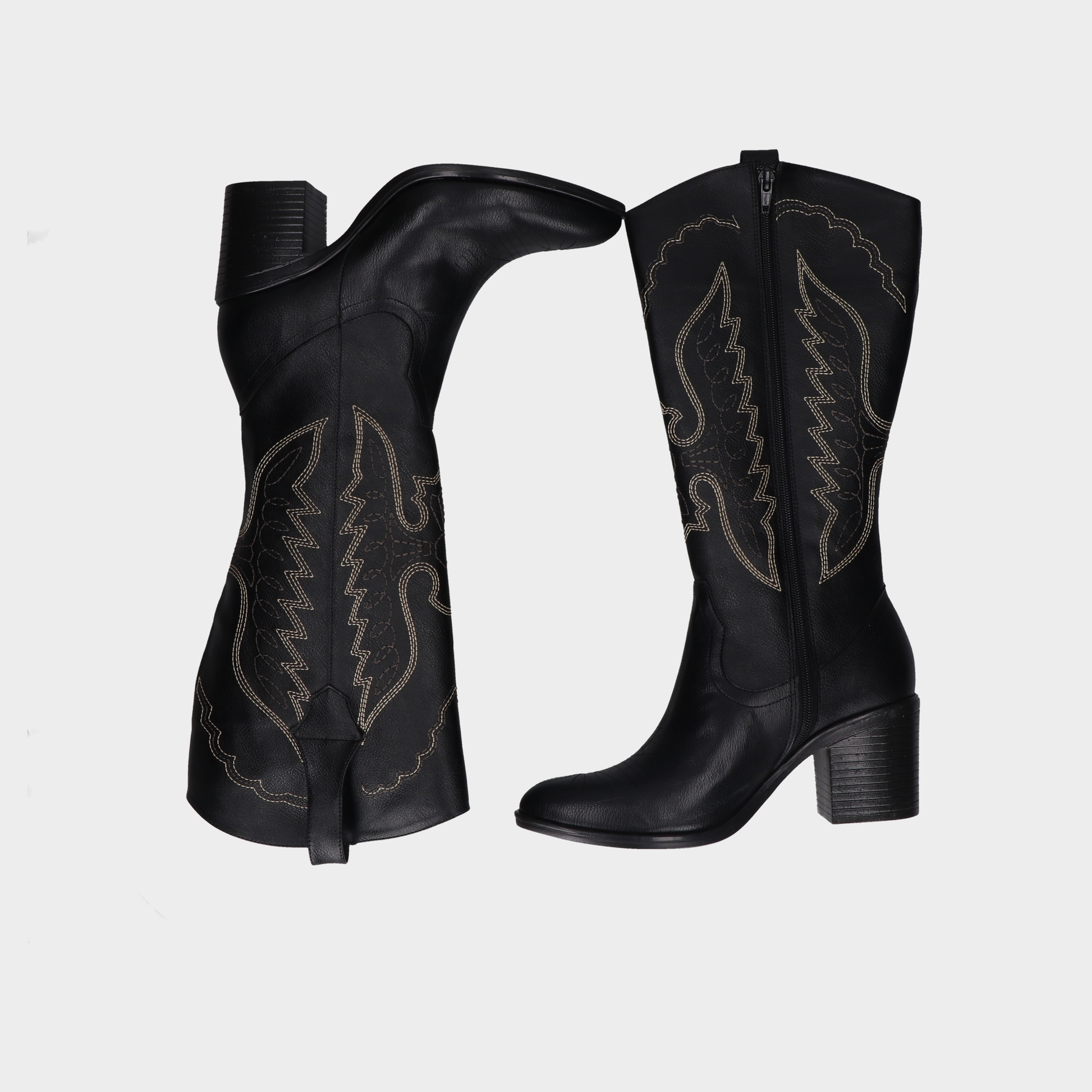 Bota Vaquera Dama 58-7030 O.Negro ?? Botas Cowboy Negras Con Bordado Blanco Y Punta Fina Tradición Con Contraste Moderno. Estas Botas Tipo Cowboy En Tono Negro Presentan Punta Fina, Tacón Medio Y Bordado Blanco Simétrico Sobre El Tubo, Con Motivos Decorativos Que Evocan Hojas Y Llamas. Las Tiras Superiores Facilitan El Calce, Mientras Que El Diseño Estilizado Las Convierte En Pieza Clave Para Atuendos Western, Conjuntos Bohemios O Looks Urbanos Con Carácter. Un Calzado Que Transmite Fuerza, Autenticidad Y Estilo Gráfico. Descubre Más Modelos Que Celebran El Diseño Clásico Con Impacto Visual.