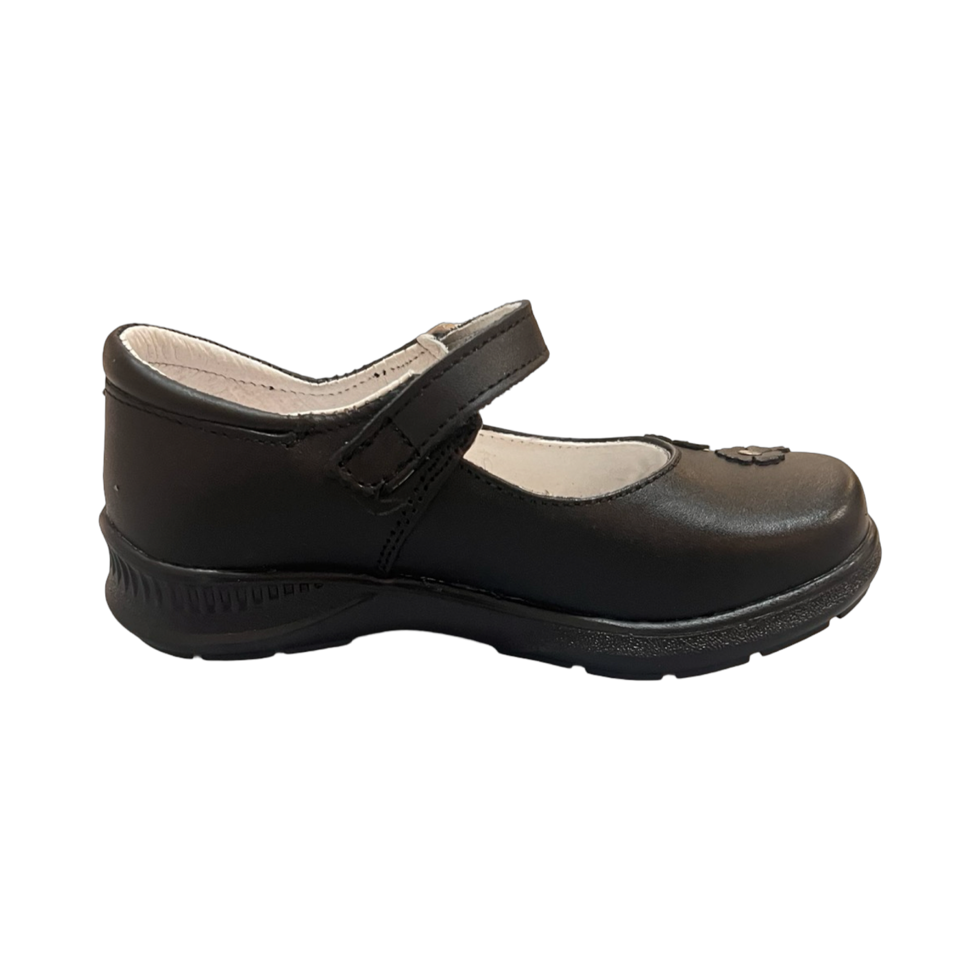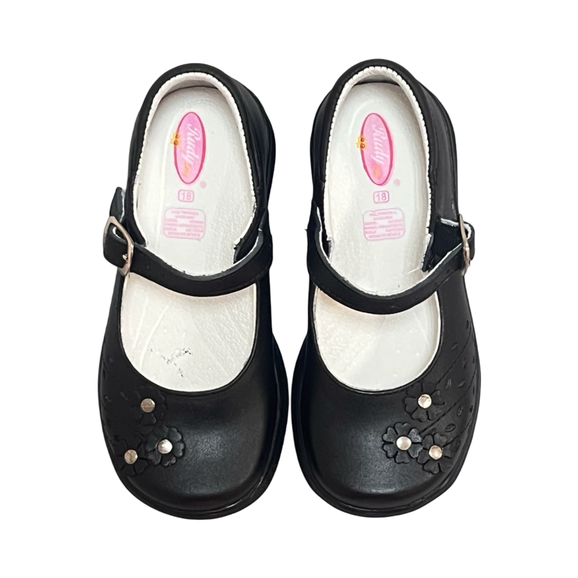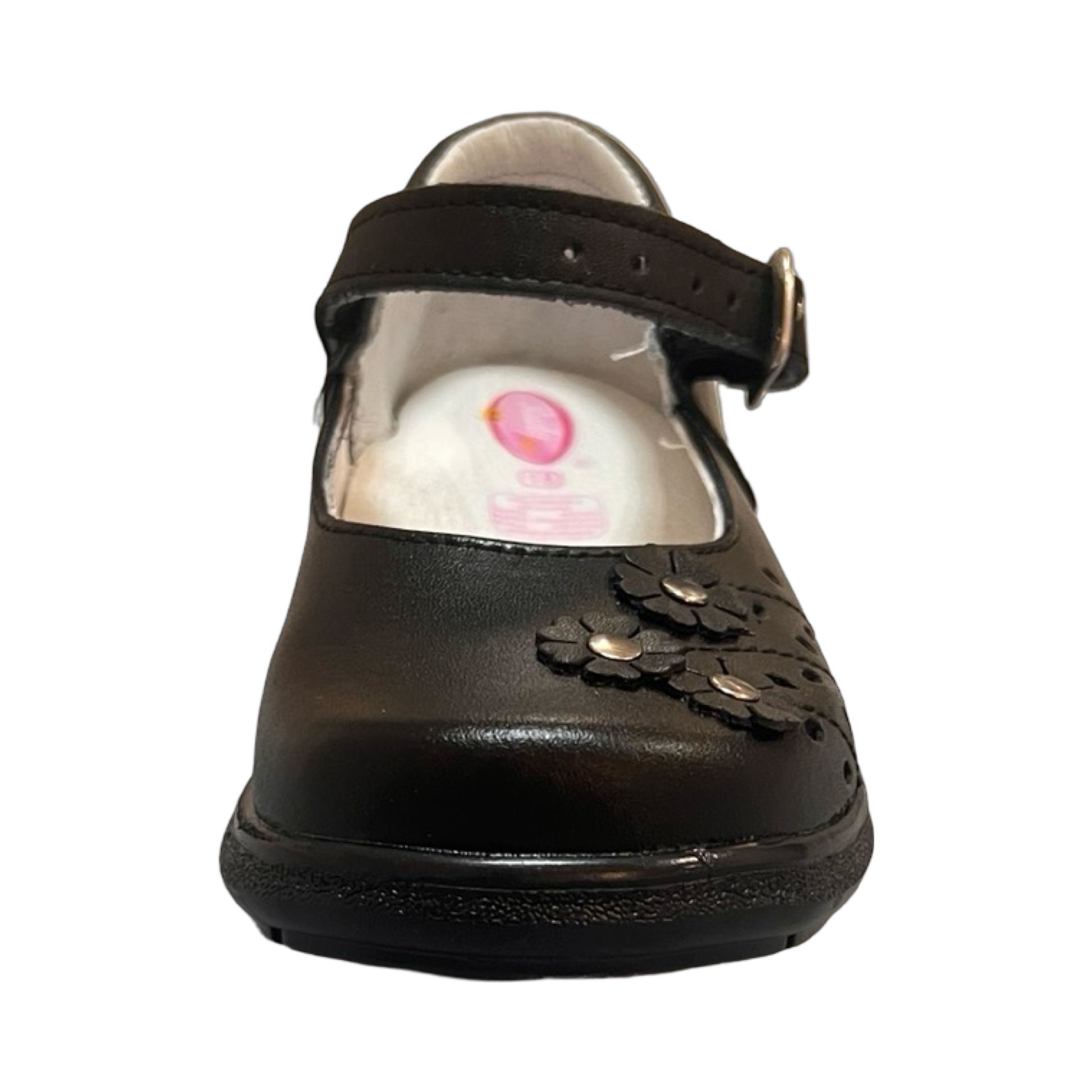 Escolar 102-R-220-1 Negro Calzado Escolar Para Niña, En Color Negro, Tipo Balerina, Con Un Toque En Diseño En Florecitas Al Frente, Ajuste Con Hebilla, Suela Antiderrapante Marca Ruditos