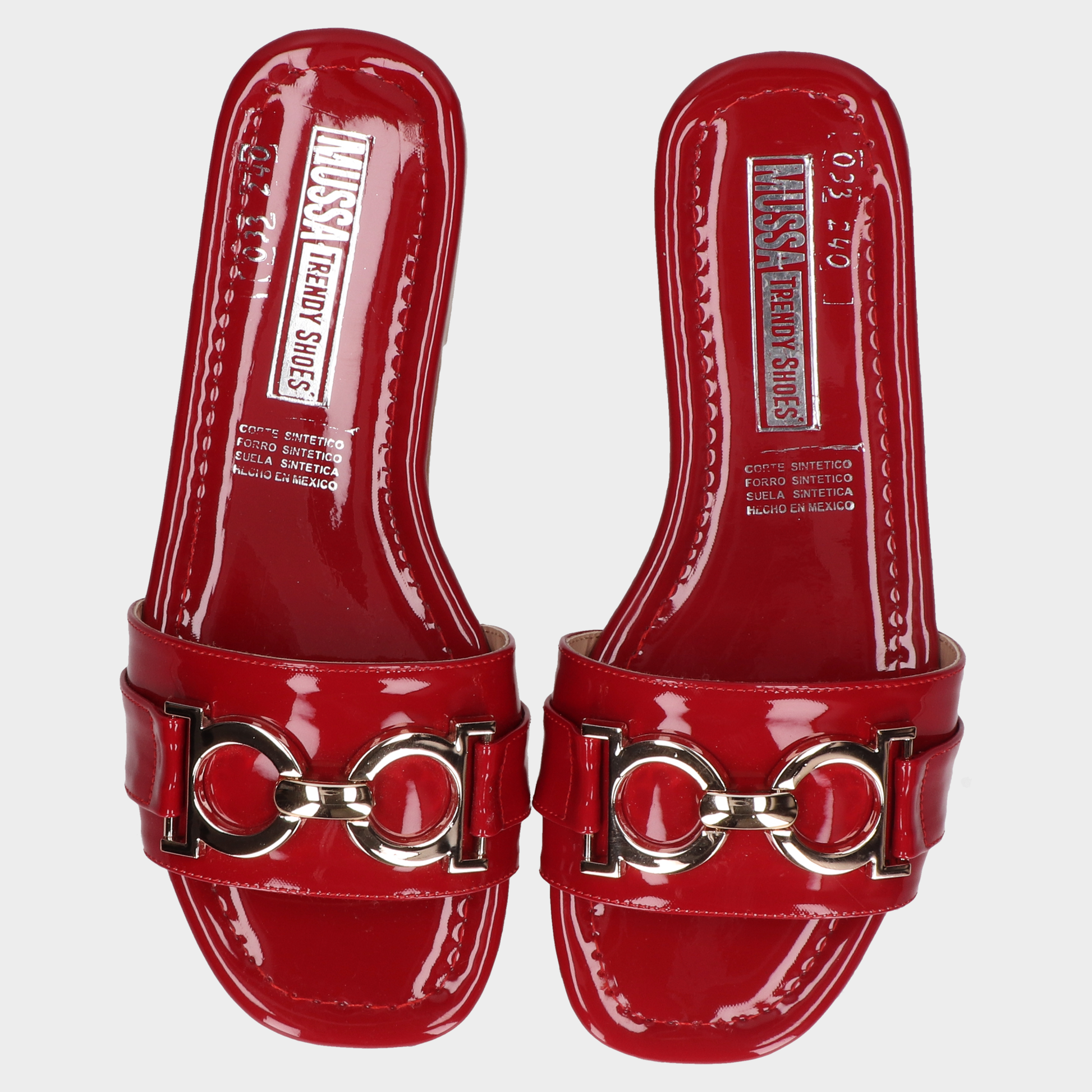 Sandalia Dama 65-Muss-33 Rojo ?? Sandalias Rojas Con Cadena Dorada Y Acabado Brillante Diseño Audaz Con Acento Glamoroso. Estas Sandalias Slip-On En Tono Rojo Brillante Combinan Punta Abierta, Suela Plana Con Ligero Realce Y Tira Superior Decorada Con Cadena Dorada. Su Estética Llamativa Y Estructura Cómoda Las Convierten En Pieza Versátil Para Atuendos Urbanos, Looks Casuales Chic O Conjuntos Festivos Con Estilo Editorial. Un Calzado Que Transmite Personalidad, Frescura Y Sofisticación. Descubre Más Modelos Que Celebran El Diseño Femenino Con Acabados Premium Y Detalles Metálicos De Alto Impacto