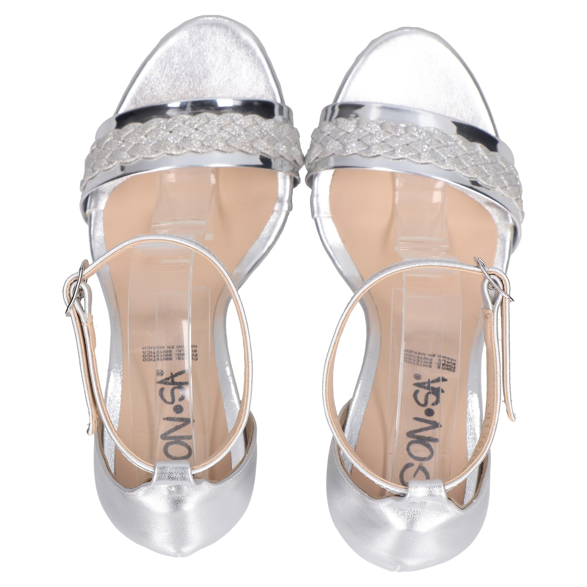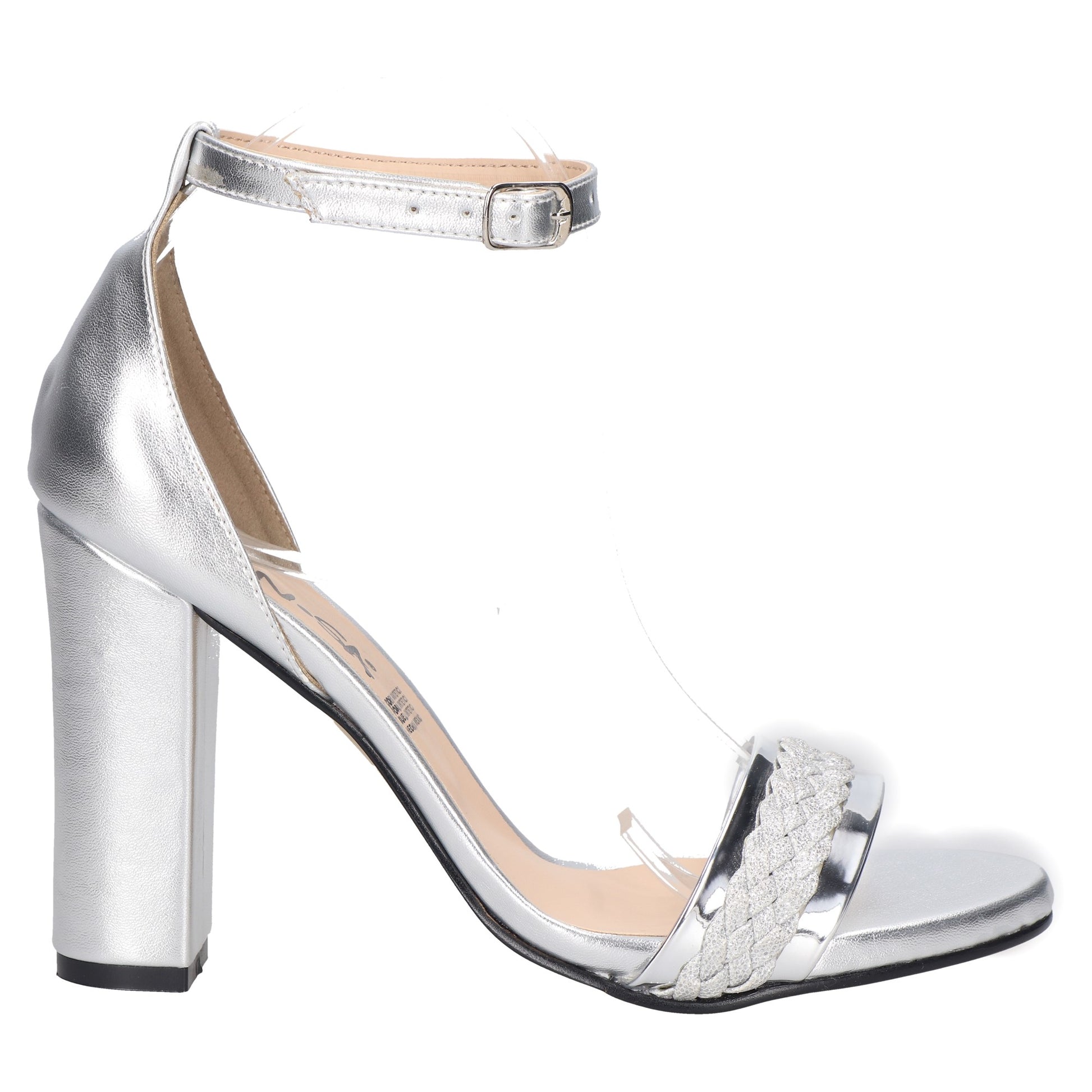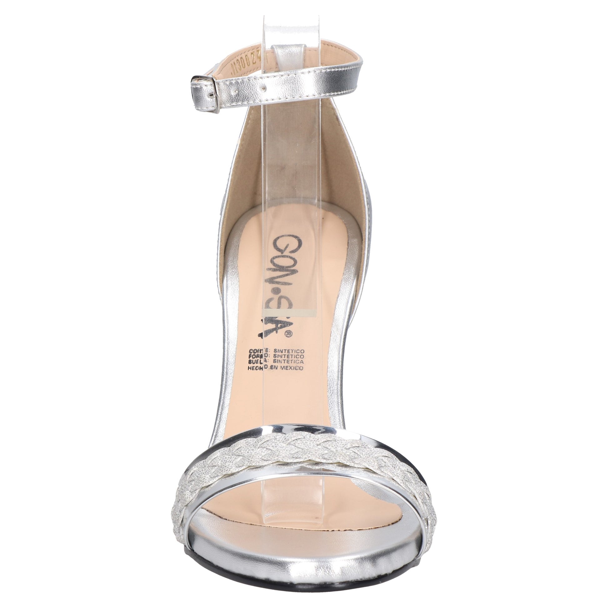 Sandalia De Tacon Dama 65-N013 Plata Hermosos Tacones En Color Plata, Con Tacón Alto Grueso, Ajuste Con Hebilla Al Tobillo, Talón Cerrado Y Cintilla Y Trenza Al Frente. Ideal Para Un Evento Formal. Marca Gonsa