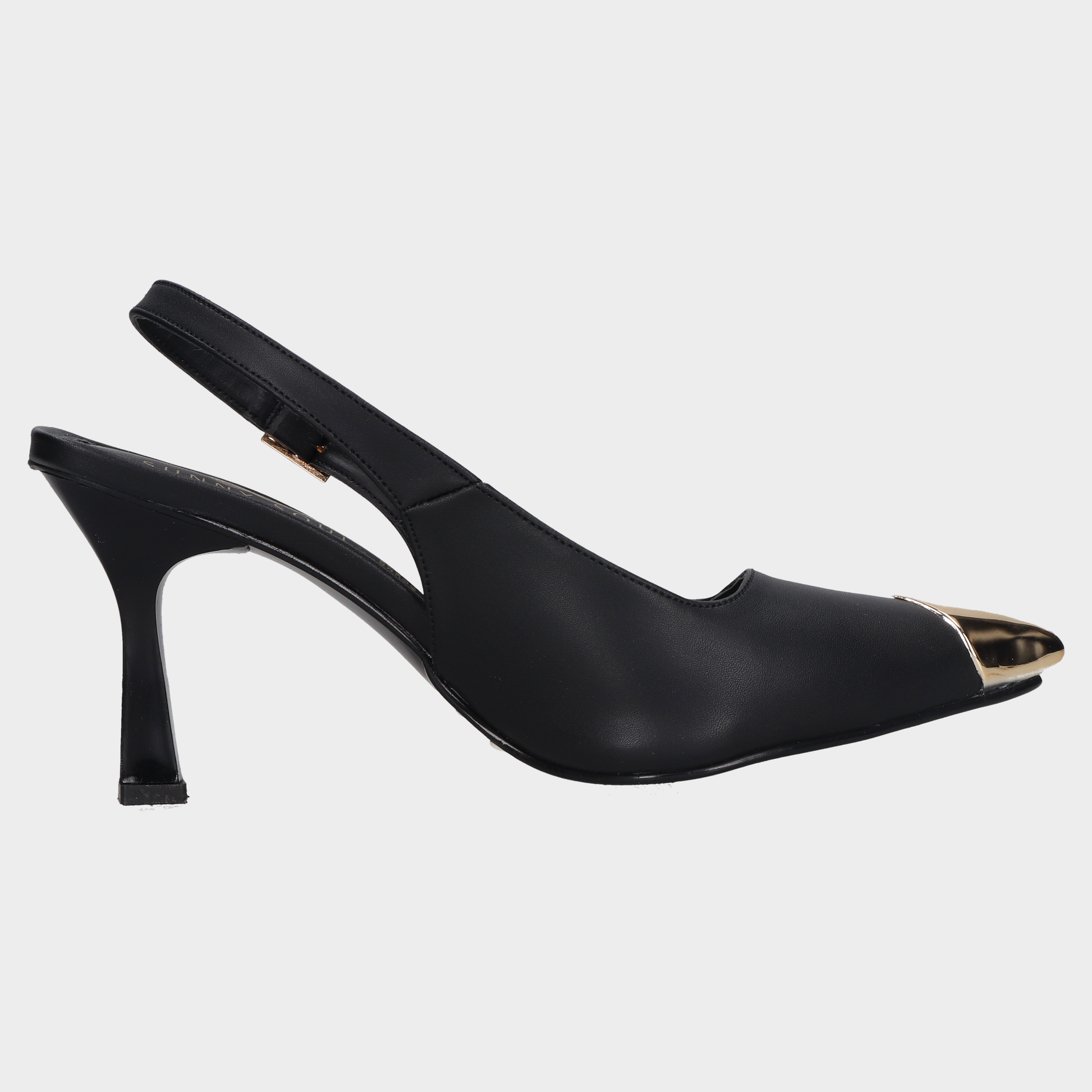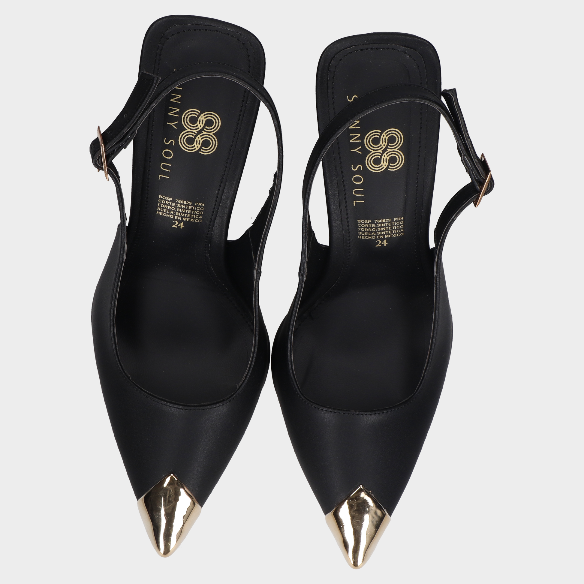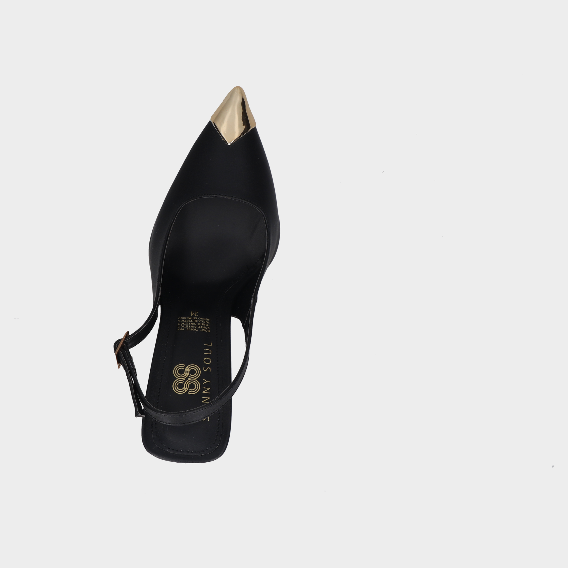 Sandalia Tacon Dama 118-C-850 Negro ?? Slingbacks Negros Con Punta Dorada Y Tacón Cuadrado Diseño Sofisticado Con Contraste Metálico. Estos Slingbacks Negros Combinan Punta Cerrada Con Acabado Dorado Brillante, Talón Abierto Con Tira Ajustable Y Tacón Medio Cuadrado Para Mayor Estabilidad. El Interior Claro Y El Contraste Entre Negro Y Dorado Los Convierten En Pieza Protagonista Para Eventos Formales, Atuendos Ejecutivos O Looks Nocturnos Con Presencia Visual. Un Calzado Que Transmite Elegancia, Seguridad Y Estilo Escénico. Descubre Más Modelos Que Celebran El Diseño Femenino Con Acabados Premium Y Siluetas Refinadas.