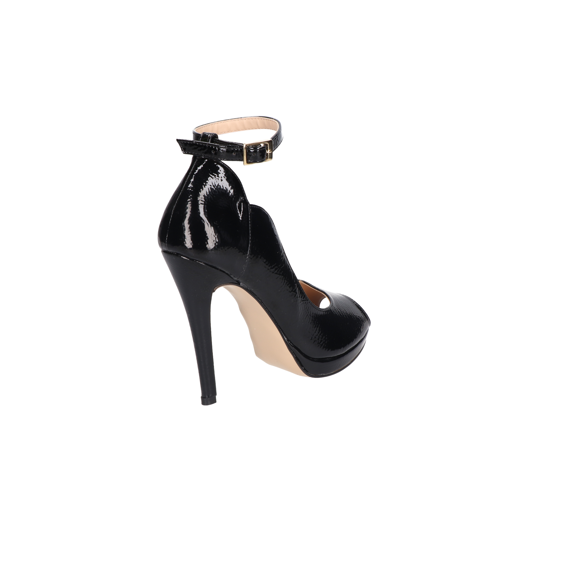 Zapatilla Dama 09-Dk 2217 Ch.Negro Hermosos Tacones Altos Y Delgados En Color Charol Negro Con Hebilla Y Punta Abierta. Ideal Para Lucir Expectacular En Un Evento Formal.