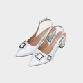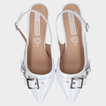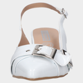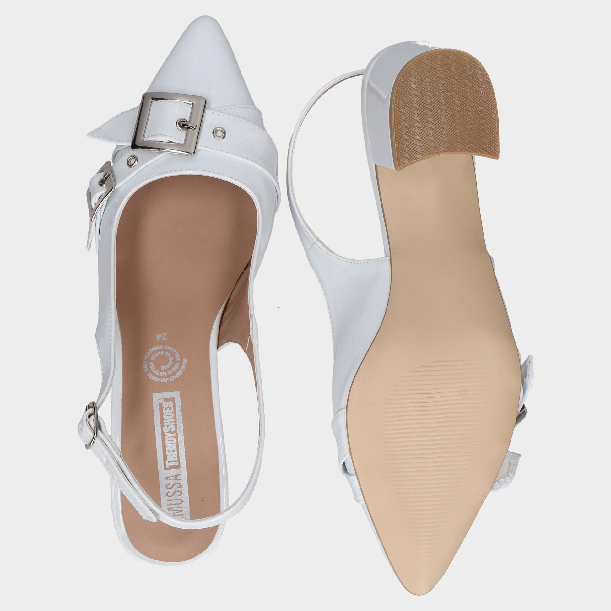 Zapatillas Dama 65-Muss-441 Chbco Estos Elegantes Zapatos De Charol Blanco Son La Combinación Perfecta De Sofisticación Y Estilo. Su Diseño De Punta Fina Con Detalle De Hebilla Metálica Agrega Un Toque Vanguardista, Ideal Para Eventos Formales O Para Elevar Cualquier Look Casual. La Correa Trasera Ajustable Proporciona Un Ajuste Seguro, Mientras Que El Tacón Grueso Brinda Comodidad Durante Todo El Día. Perfectos Para Lucir Chic En Cualquier Ocasión.